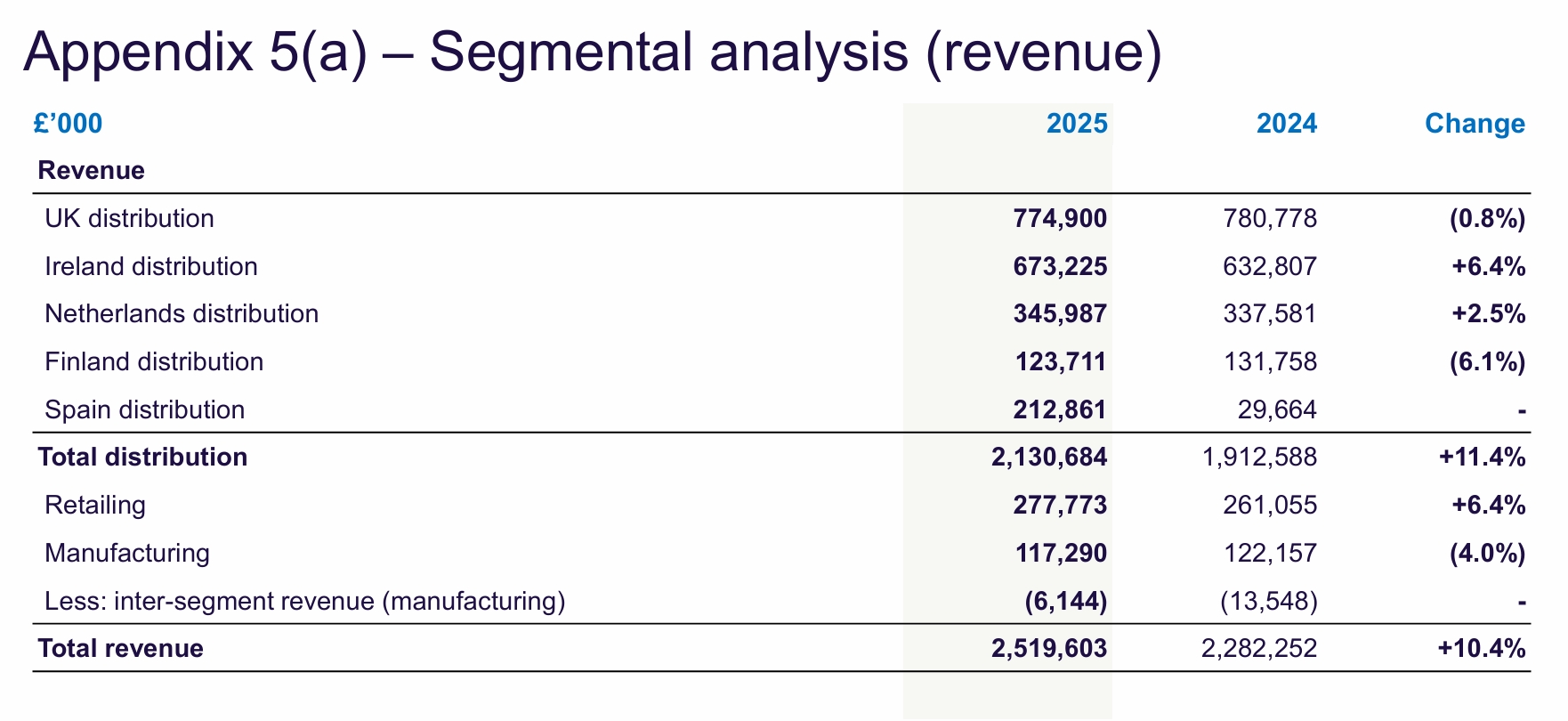 During the financial year, the Group adopted a new ‘region-based’ reporting structure which it states “better reflects the Group’s strategy”. Accordingly, having previously been organised on the basis of five distribution segments, one retailing segment and one manufacturing segment, it is now organised into four geographical areas — Island of Ireland, Great Britain, Northern Europe and Iberia — encompassing a mix of the former segments within each:
